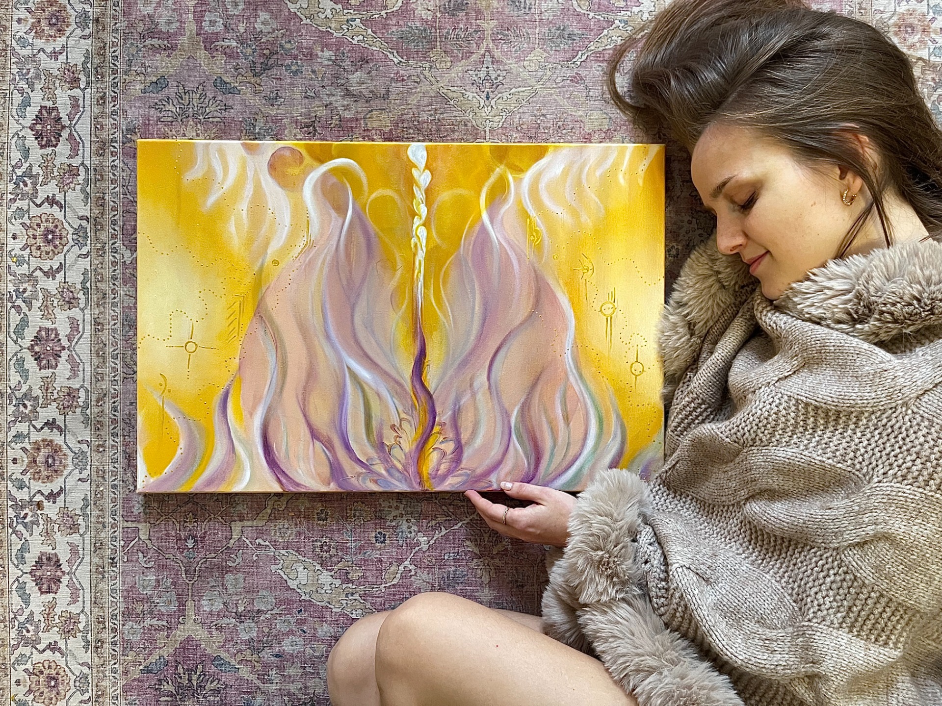 OBRAZ DOMOV - hluboký pocit v sobě, vzpomínky na domov duše, na svou čistou esenci, prozáření vnitřního domova do hmoty. Tento obraz mně při malbě obrovsky sytil a posunul. Téma DOMOV, cítit se v sobě opravdu a hluboce DOMA bylo (a asi ještě na etapy bude) moje životní téma. Za život jsem zažila spousty vln žalu a stesku po domově. po tom místě někde daleko ve hvězdách kde má duše vznikla. Klid, to je ten pocit, který jsem zažila a od té doby zažívám, když se mi toto téma pro danou etapu doskládalo. A i ten je do obrazu ukotven. Schoulení se v těle doma se svou duší. Dovyživení se sama sebou, svou hlubokou esencí kým jsem. Kde jsem v sobě doma. Následné vyzáření a manifestace tohoto DOMA i do hmoty. Do hmotného reálného domova. Přináší změny, narovnání vnitřního i vnějšího domova, klid, propojení s domovskou hvězdou hluboko v nitru. Propojuje také s vědomím a nastavením mysli toho, že vše co si v životě zasloužíš najdeš tam kde právě jsi. Volá si tě toto téma a OBRAZ DOMOV? Obraz možné koupit pouze s osobním předáním. Součástí balíčku s obrazem je totiž i předávací rituál, kde obraz společně zasvětíme do tvých/ vašich energií. Toto potkání má i terapeutický, očistný, tvořivý přesah. Doba trvání je až 4hodiny. Formát: Kvalitní kopie na dřevěném rámu s OSOBNÍM ZASVĚCENÍM! ( do tvých/ vašich energií) BRÁNY OTEVŘENY. Velikost : 60 x 40 cm ________________ Ps.: Je možné objednat si také obraz DOMOV vyloženě na míru. Více info k osobním obrazům najdeš tady https://www.obrazduse.cz/cenik/